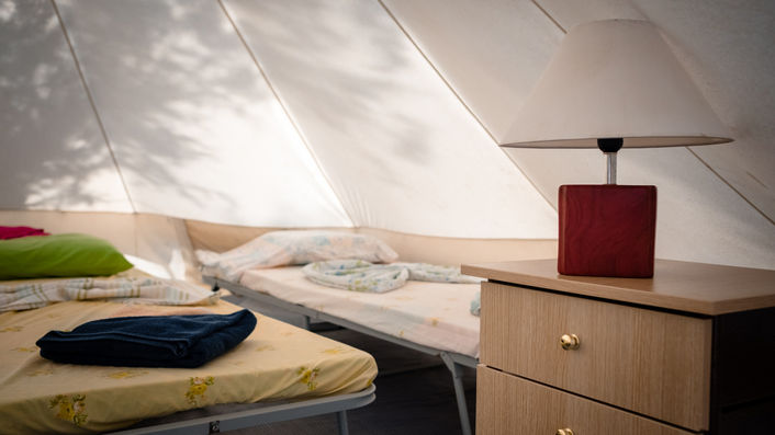 Spacious canvas bell tents equiped with a bed, lighting and insect repellant device. Includes a seating area just outside the entrance of the tent.